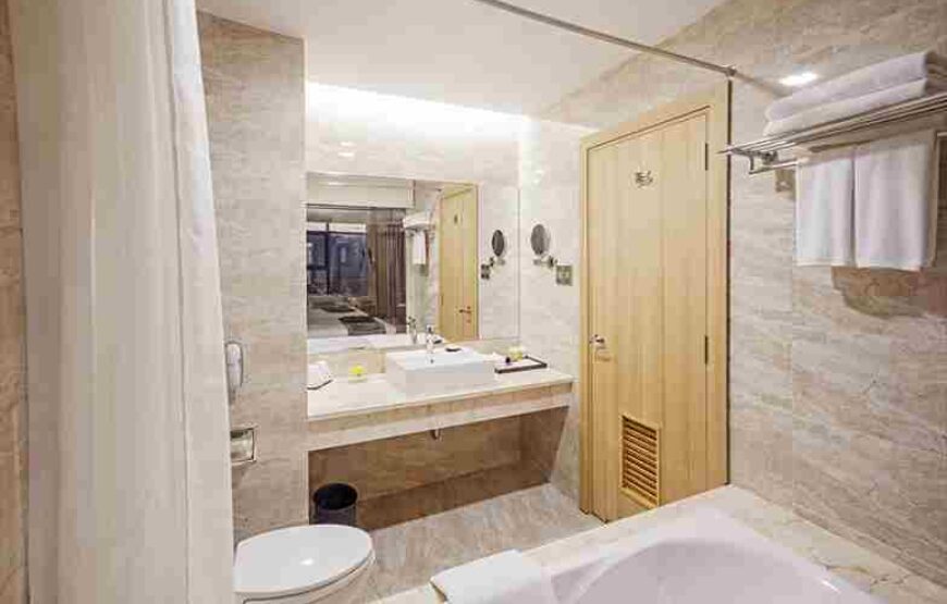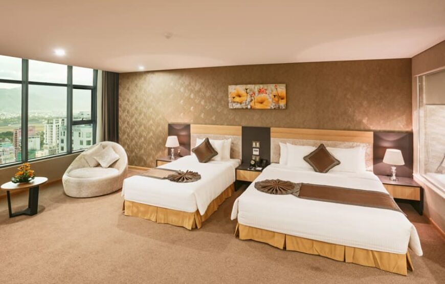 Phòng dành cho gia đình với 1 giường đôi và 1 giường đơn, cửa sổ hướng biển, phù hợp cho 3 khách. Không gian rộng rãi, tiện nghi, lý tưởng cho kỳ nghỉ gia đình