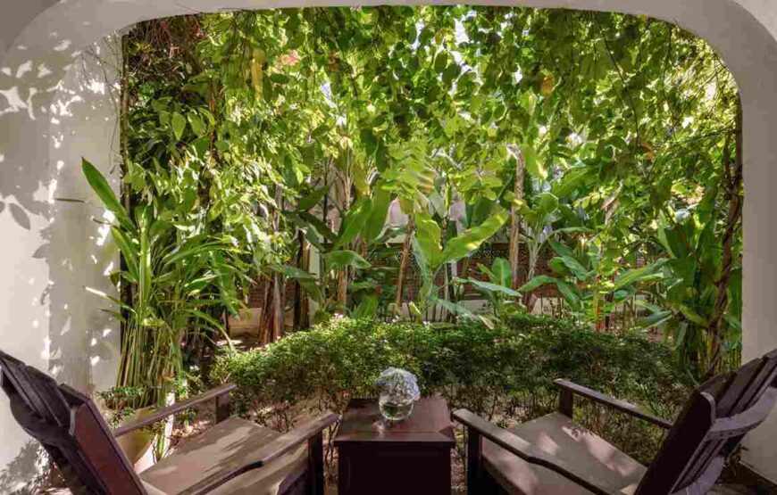 Một không gian rộng rãi lý tưởng cho gia đình, ngập tràn ánh nắng vàng dịu và sắc xanh từ khu vườn tựa bên mái hiên. Căn phòng được bài trí khéo léo với vách ngăn giữa các khu vực nghỉ, mang lại cảm giác riêng tư nhưng vẫn giữ được sự ấm cúng và gắn kết – nơi cả gia đình có thể thư giãn và tận hưởng những khoảnh khắc bên nhau