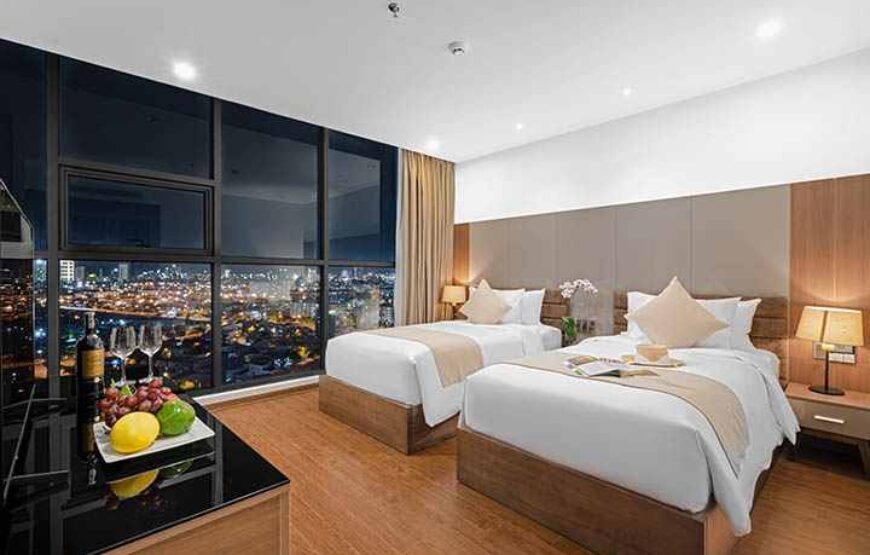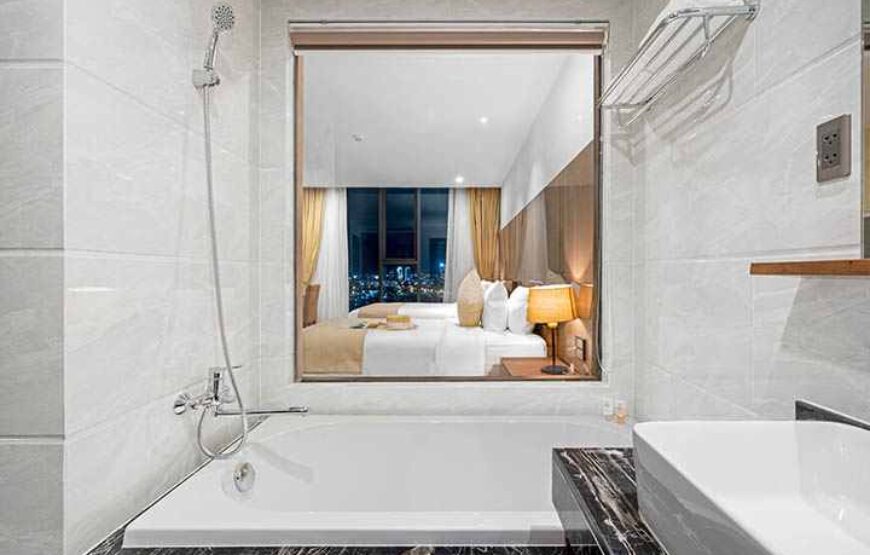 Căn phòng mở ra góc nhìn tuyệt đẹp hướng thành phố, nơi ánh đèn và cuộc sống sôi động tạo nên một bức tranh sống động. Không gian lý tưởng để vừa làm việc, vừa nghỉ dưỡng trong sự sang trọng.